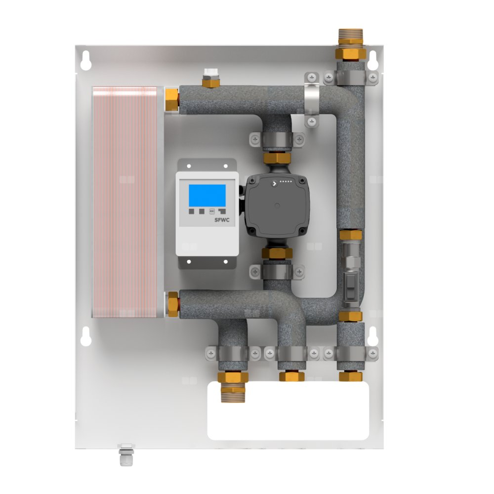 Stacja przygotowania ciepłej wody użytkowej (CWU) to urządzenie wykorzystywane do efektywnego i szybkiego podgrzewania wody użytkowej w budynkach mieszkalnych i komercyjnych. Działa na zasadzie przepływowego ogrzewania wody, dzięki czemu woda jest podgrzewana bezpośrednio w momencie jej użycia, co eliminuje konieczność magazynowania dużych ilości ciepłej wody i zmniejsza straty energii. Stacja wyposażona jest w wymiennik ciepła, który pozwalają na efektywne wykorzystanie ciepła pochodzącego z różnych źródeł, takich jak kotły gazowe, pompy ciepła czy instalacje solarne. Dzięki zaawansowanej automatyce, stacje przygotowania CWU mogą dostosowywać swoją pracę do bieżącego zapotrzebowania na ciepłą wodę, co pozwala na oszczędność energii i zwiększenie komfortu użytkowników. System zawiera stalową szafkę zamykającą.