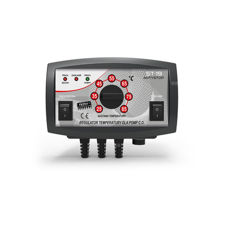 Regulator ST-19 antystop przeznaczony jest do sterowania pompą obiegu wody centralnego ogrzewania. Ustawianie temperatury zadanej dokonujemy za pomocą potencjometru. Zadaniem regulatora jest: załączanie pompy, jeśli temperatura uzyska zadaną wartość, oraz wyłączanie jej – jeśli piec wychłodzi się o 2°C poniżej zadanej. Taki tryb pracy zapobiega niepotrzebnemu działaniu pompy, co pozwala zaoszczędzić energię elektryczną oraz przedłuża żywotność pompy i podnosi jej niezawodność. Sterownik St-19 posiada również dodatkową funkcję ANTYSTOP, która zapobiega zastaniu pompy obiegowej poza sezonem (pompa załącza sie co ok. 10 dni na 1 minutę).