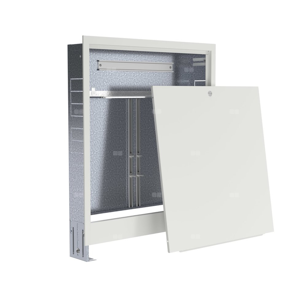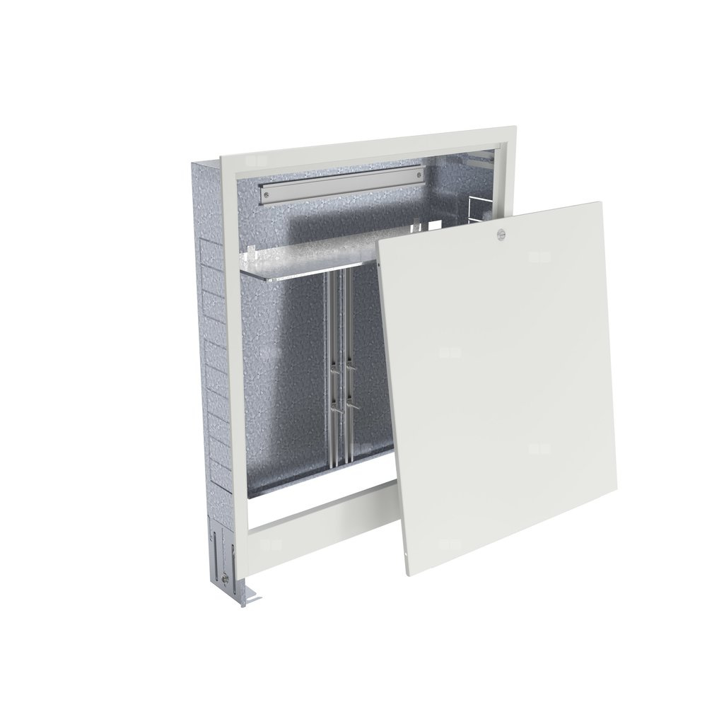 Szafki podtynkowe do rozdzielaczy ogrzewania podłogowego i grzejnikowego. Zastosowana ochrona antykorozyjna: płukanie chemiczne (odtłuszczanie), powłoka cyrkonowa, malowanie proszkowe farbą epoksydowo-poliestrową. Korpus szafki cynkowany wykonany z jednego arkusza blachy - łączony bez spawania. Ramka i drzwi szafki w całości malowane proszkowo. Łatwy, czysty montaż rozdzielacza. Ułatwiony szeroki dostęp do rozdzielacza podczas montażu. Mniejsze prawdopodobieństwo uszkodzenia ramki i drzwi szafki. Zamek na monetę. Szyny montażowe cynkowane z kompletem śrub i nakrętek ułatwiających montaż rozdzielacza.