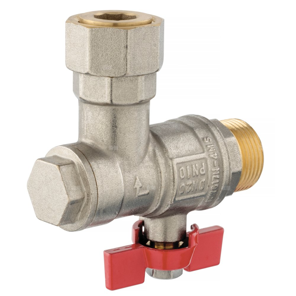 Zawór kątowy z obrotową nakrętką. Uszczelnienie płaskie, uszczelka EPDM. Konstrukcja zaworu umożliwia prosty montaż i demontaż urządzeń. Zawór wykonany jest z wysokogatunkowego mosiądzu CW617N - 4MS. Zastosowanie w instalacjach, gdzie medium to woda lub woda/glikol. Uchwyt zaworu w postaci motylka umieszczony jest pod korpusem zaworu. Zawór posiada filtr ze stali nierdzewnej AISI304