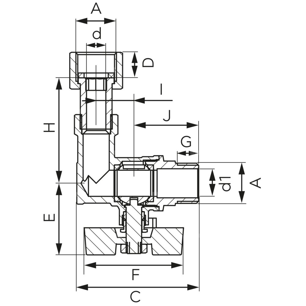 Zawór kątowy z obrotową nakrętką. Uszczelnienie płaskie, uszczelka EPDM. Konstrukcja zaworu umożliwia prosty montaż i demontaż urządzeń. Zawór wykonany jest z wysokogatunkowego mosiądzu CW617N - 4MS. Zastosowanie w instalacjach, gdzie medium to woda lub woda/glikol. Uchwyt zaworu w postaci motylka umieszczony jest pod korpusem zaworu