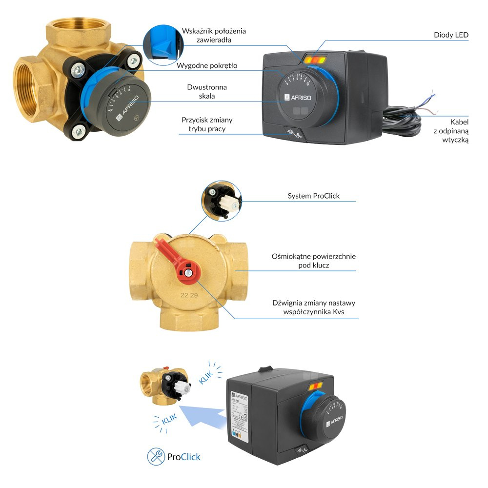 Urządzenia wyposażone w system ProClick – pozwala na bezpośredni montaż siłownika na zaworze bez użycia dodatkowych narzędzi.