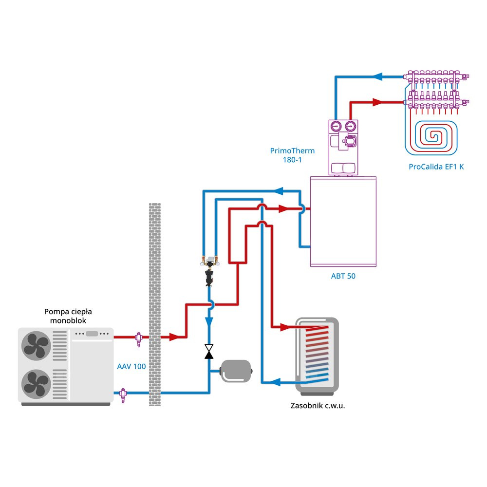 Stosowany w instalacjach grzewczych z pompą ciepła.Montowany na instalacji we wnętrzu budynku pomiędzy pompą ciepła, a zasobnikiem c.w.u. i buforem/instalacją.