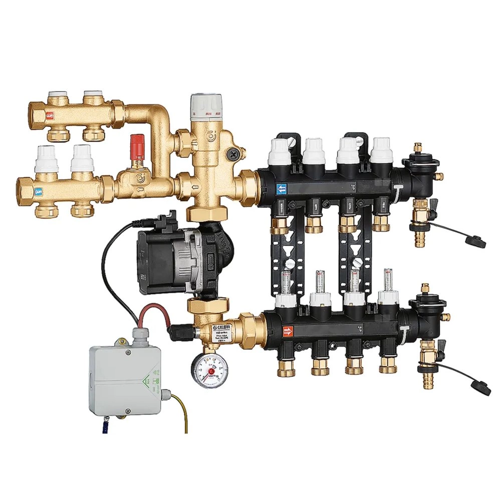 Zespół regulacyjny - regulacja stałotemperaturowa. 9 wyjść. Dodatkowy rozdzielacz obiegu pierwotnego z dwoma wyjściami.