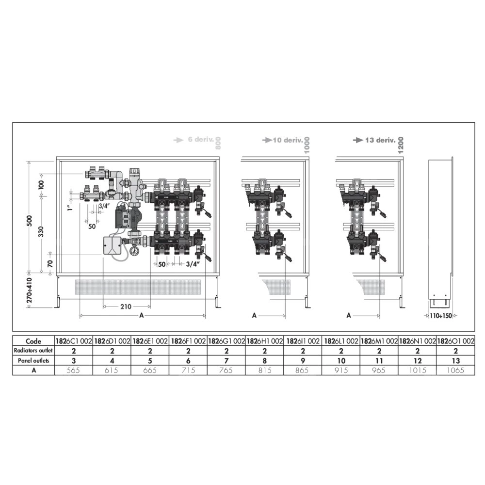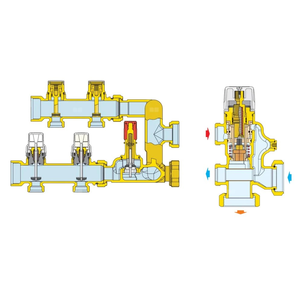 Zespół regulacyjny - regulacja stałotemperaturowa. Wstępnie zmontowany w skrzynce inspekcyjnej. Dodatkowy rozdzielacz obiegu pierwotnego. W komplecie: - termostatyczny ukłąd regulacji; - para rozdzielaczy z zaworami regulacyjnymi i zaworami odcinającymi obiegu pierwotnego; - para rozdzielaczy z kompozytu z wbudowanymi przepływomierzami i zaworami odcinającymi; - zestaw obejściowy obiegu pierwotnego; - termostat bezpieczeństwa; - wysokowydajna pompa UPM3 Auto L 25-70; - skrzynka inspekcyjna naścienna ze wspornikami podłogowymi. Przyłącze: G 1" (ISO 228-1) GW, Podłączenie do złączek Caleffi. przyłącza wylot: G 3/4" A (ISO 228-1) GZ, 11 wyjść. podłączenie obieg pierwotny: G 3/4" A (ISO 228-1) GZ, 2 wyjścia. Maksymalne ciśnienie pracy: 6 bar. Zakres regulacji temperatury: 25–55 °C. Zasilanie elektryczne: 230 V (AC). Szerokość: 1200.
