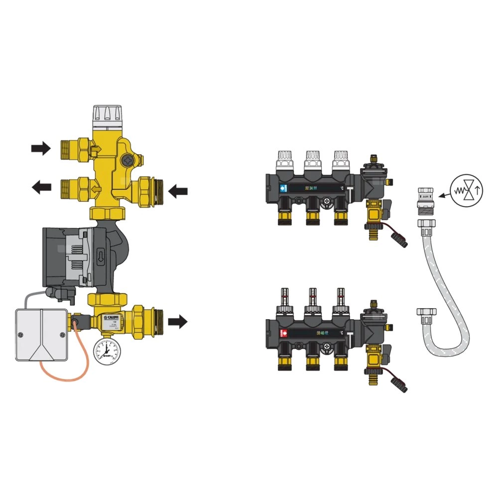 Zespół regulacyjny – regulacja stałotemperaturowa. Wstępnie zmontowany w skrzynce inspekcyjnej W zestawie: - termostatyczny układ regulacji; - para rozdzielaczy z kompozytu z wbudowanymi przepływomierzami i zaworami odcinającymi; - termostat bezpieczeństwa; - wysokowydajna pompa UPM3 Auto L 25-70; - skrzynka inspekcyjna naścienna ze wspornikami podłogowymi. Przyłącze: G 3/4" A (ISO 228-1) GZ, Podłączenie do złączek Caleffi. przyłącza wylot: G 3/4" A (ISO 228-1) GZ, 7 wyjść. Maksymalne ciśnienie pracy: 6 bar. Zakres regulacji temperatury: 25–55 °C. Zasilanie elektryczne: 230 V (AC). Szerokość: 800.