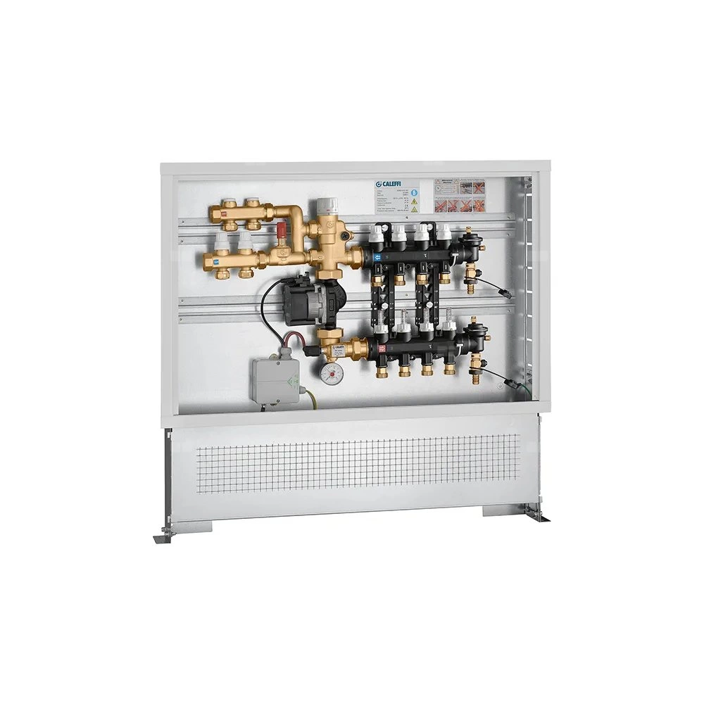 Zespół regulacyjny – regulacja stałotemperaturowa. Wstępnie zmontowany w skrzynce inspekcyjnej. 7 wyjść. Dodatkowy rozdzielacz obiegu pierwotnego z dwoma wyjściami.