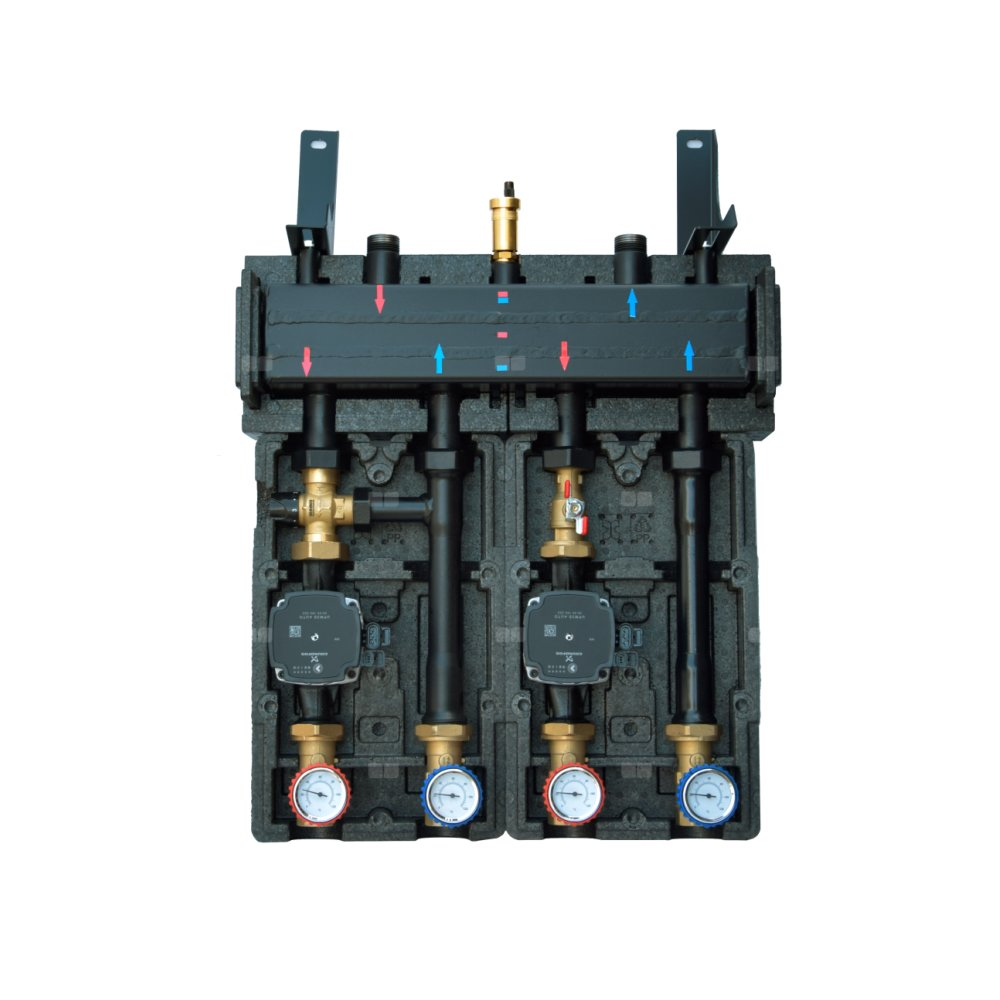 Model Zestaw DX. Z Grupami Sa 125 – Dn 25 Z Izolacją I Smtc1 125 – Dn 25 Z Izolacją, Rozdzielaczem Cx 100 2F – Dn 25, Uchwytami Naściennymi Delta Oraz Zaworem Zwrotnym.