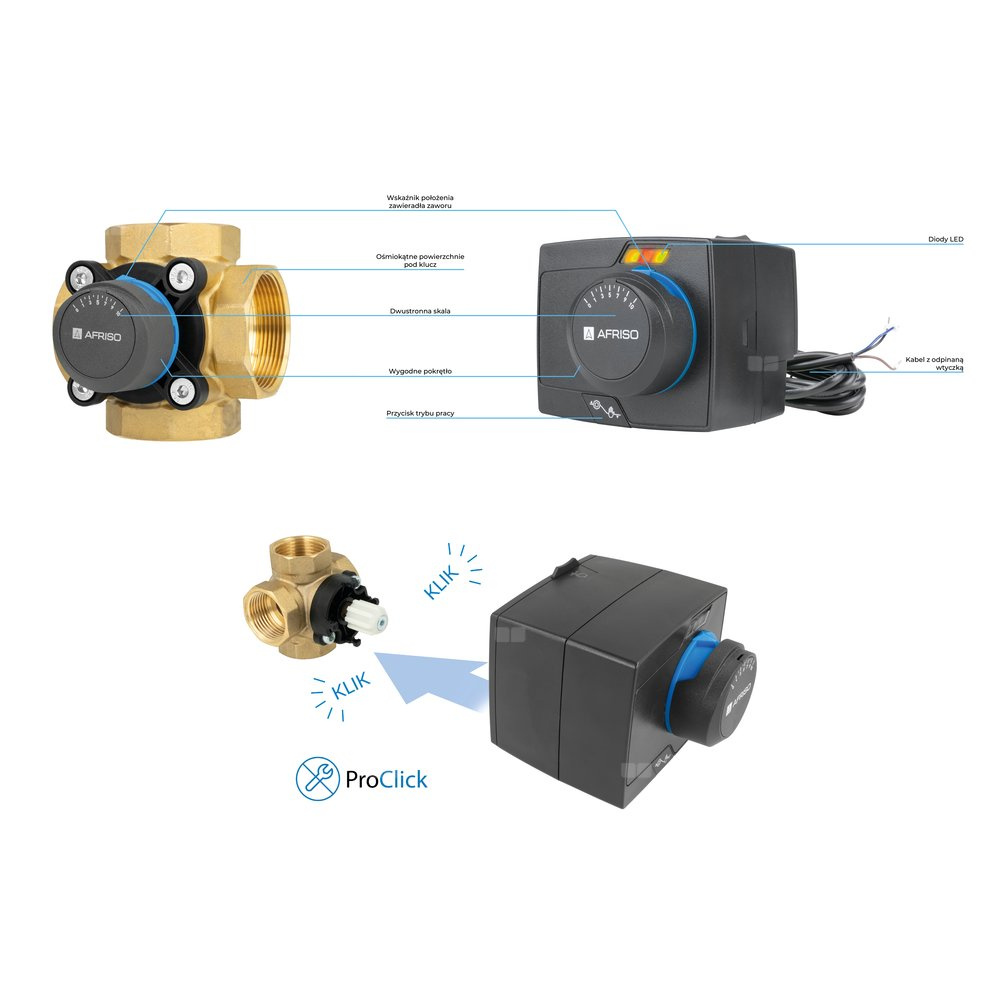 Urządzenia wyposażone w system ProClick – pozwala na bezpośredni montaż siłownika na zaworze bez użycia dodatkowych narzędzi.