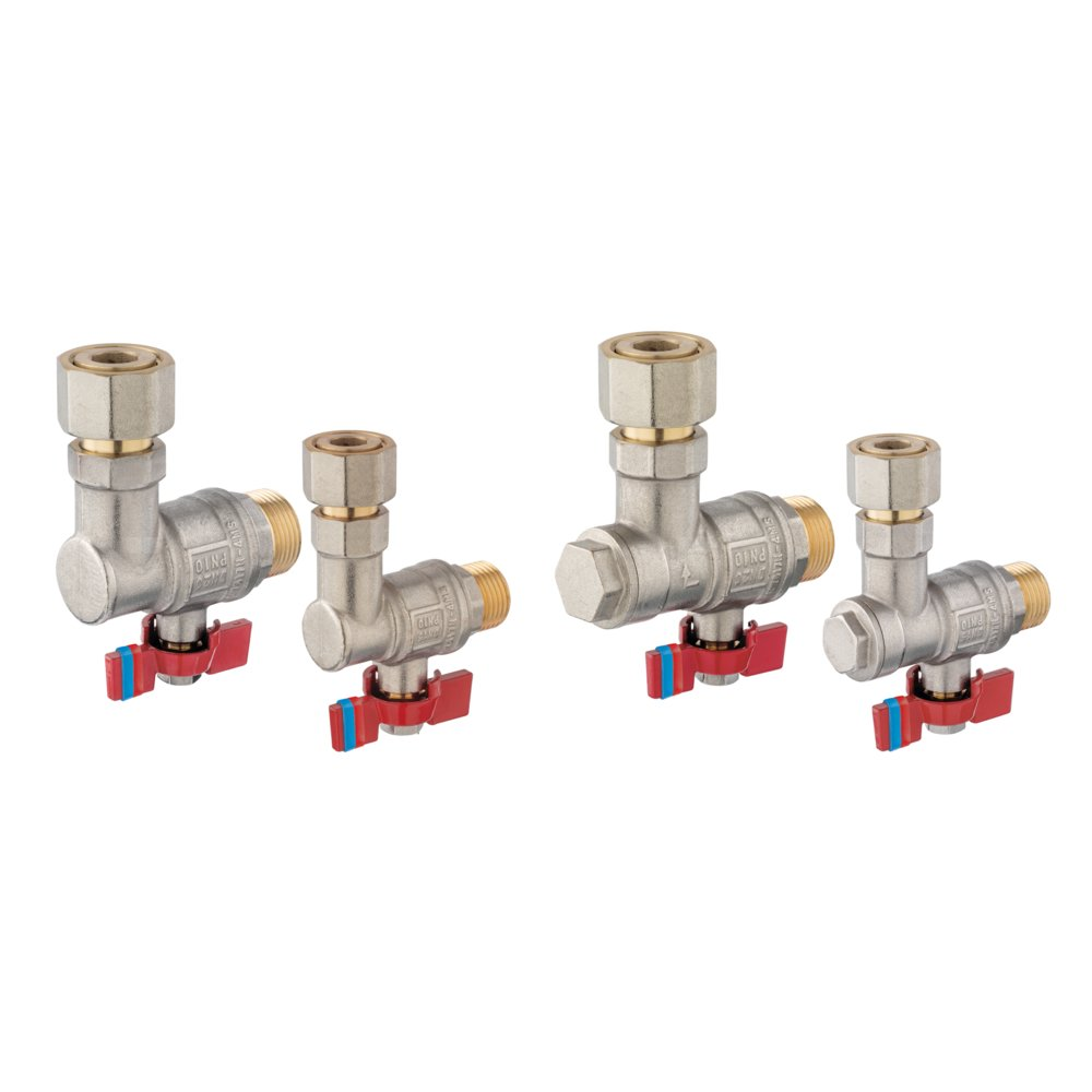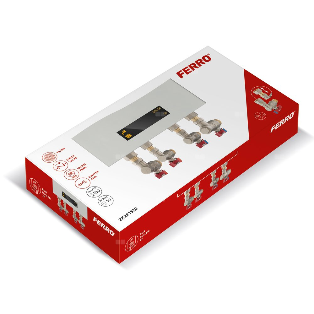 Zestaw zaworów kulowych kątowych z obrotową nakrętką. Zawory dedykowane są pod kotły grzewcze dwufunkcyjne. Zestaw zawiera zawór z filtrem ze stali nierdzewnej AISI304 oraz zaworem zwrotnym oraz zawór kątowy kulowy z uchwytem w postaci motyla pod korpusem zaworu, zawór z filtrem o średnicy DN15 oraz zawory kulowe kątowe DN15 i DN20